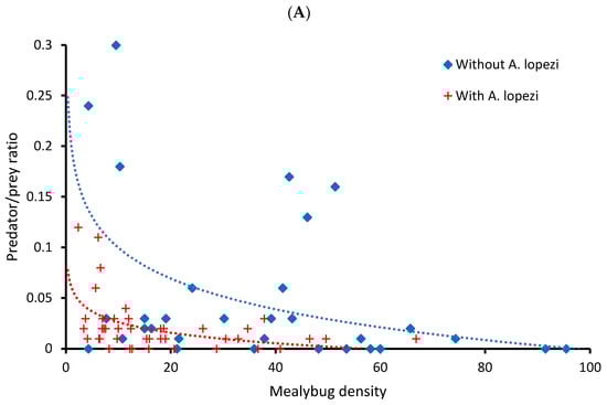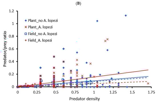 Biological control activity relates to P. manihoti infestation pressure and predator density in cassava fields with or without an introduced parasitoid. In the panel (A), a predator/prey ratio is obtained by dividing the field-level density of all predators by that of P. manihoti. (Marginally) significant linear or logarithmic regression curves are shown. In the panel (B), correlation trends are shown between log(x + 1) transformed predator/prey ratio and predator density, as recorded at the plant- or field-level. Both predator and mealybug density represent the number of individuals per plant. Patterns are plotted for settings with A. lopezi (red) and those without (blue). In the panel (B), full and dashed lines mirror correlation trends at the plant or field level, respectively. For visualization purposes, the X axis of the upper panel was truncated at 100 mealybugs/plant and one predator/prey ratio outlier removed from panel (A) and panel (B), without affecting the statistical significance of regression curves. All statistical details are provided in the main text.