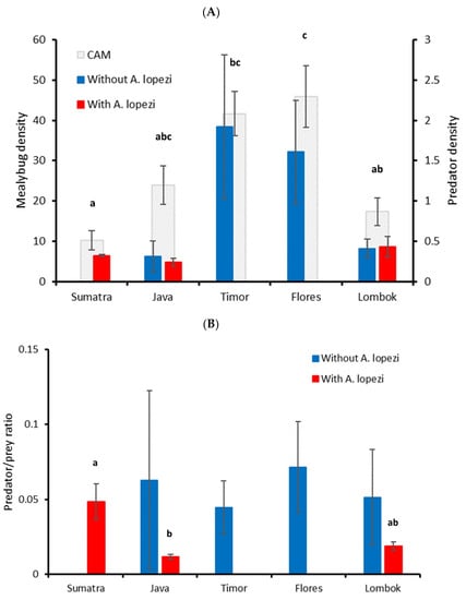 Over the course of 2017–2018, insect surveys were carried out in 77 CAM-invaded cassava fields across five large Indonesian islands (Supplementary Table S1). From large to small in size, surveyed islands comprised Sumatra (n = 11 fields), Java (n = 36), Timor (n = 10), Flores (n = 11) and Lombok (n = 9). Fields were managed by individual farmers using locally prevailing practices; as cassava is a low-value, long-season crop that is primarily cultivated by resource-poor farmers, (especially) in Flores, Timor and Lombok, where pesticide use was rare. Survey protocols were adopted from Wyckhuys et al. []. In brief, we selected older fields (i.e., 8–10 months of age) in the main cassava-growing districts of each island with individual fields spaced at min. 1 km distances. Fields were 1.52 ± 0.17 ha in size (mean ± SE) and planted with one out of five locally popular varieties. Field visits were planned during the local dry season; most fields were visited during October–November 2017, while an additional set of fields in Lampung (Sumatra) and eastern Java were also sampled during September–October 2018. In each field, five linear transects were randomly chosen and ten plants were sampled along each transect. As such, for a total of 50 cassava plants per field, we visually recorded the number of P. manihoti individuals, the prevailing associated predators, i.e., lacewings (Neuroptera: Chrysopidae), ladybeetles (Coleoptera: Coccinellidae) and spiders (Araneae). In addition, considering how mealybug-tending ants interfere with CAM predation [], we recorded the number of individual ants per cassava plant. In-field identification of P. manihoti was based on morphological characteristics such as coloration, size and absence of abdominal waxy filaments. Following transect walks, we computed the average abundance of P. manihoti and its associated predators or tending ants per plant. Field locations were recorded using a handheld GPS unit (Garmin Ltd., Olathe, KS, USA), while voucher specimens of P. manihoti and A. lopezi were deposited at Bogor Agricultural University (Bogor, Indonesia). A predator/prey ratio was further computed by dividing the field-level abundance of all predators by that of P. manihoti, i.e., specifically geared to this single invasive pest. Predator/prey ratio is a sound proxy of biological control activity or predation pressure [], and might thus be indicative of biotic resistance.
