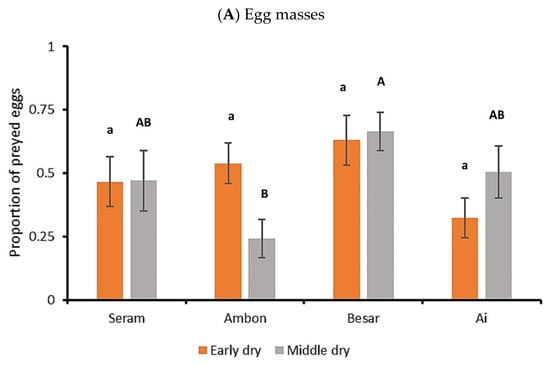 Across sites and sampling events, 49.2% of the eggs within the exposed FAW egg masses (average size of 145.6 ± 11.1 eggs per egg mass) were not recovered following a 24 h exposure on maize foliage. Egg predation rate was affected by seasonality, exhibiting inter-island differences during mid dry season (Kruskal–Wallis H = 8.103, p = 0.044), but not during the onset of the dry season (H = 5.996, p = 0.112; Figure 3A). Across sampling events, the lowest and highest egg predation rates were recorded in Ambon (24.1 ± 7.6%) and Banda Besar (66.4 ± 7.6%), respectively. Hence, the highest egg predation rate was logged on the second smallest island.