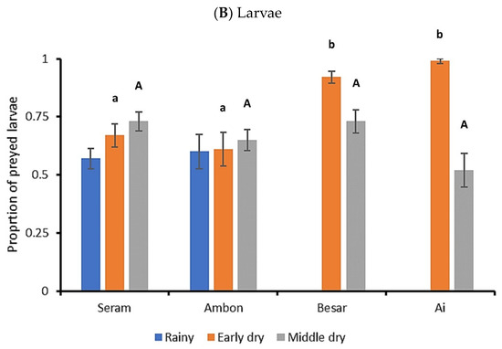 Predation rates of canopy-exposed FAW egg masses (A) and sentinel larvae (B) in four Indonesian islands of varying size. The graphs depict the average proportion (±SE) of FAW eggs or larvae that are not recovered after 24 h, following their exposure on potted maize plants. Data are shown for experiments conducted during the rainy, early dry and middle dry season. In panel (B), data are shown for three separate sampling events on Seram and Ambon, and two sampling events on Besar and Ai islands. Statistical differences are indicated by different (capital, lowercase) letters above each bar (Kruskal–Wallis, p < 0.05). Statistical data are provided in the main text.