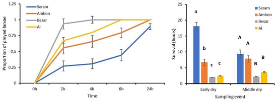 Soil-exposed larvae experienced high levels of predation, which equaled 50.1 ± 4.8% after 2 h and 89.4 ± 2.6% after 24 h (Figure 4). Predation rates gradually increased over time in all sites, with the steepest increase in Besar and Ai islands. Survival rates equally reflected high predation rates on small islands; estimated survival duration was shortest on Besar (2.1 ± 0.0 h) and longest on Seram (18.1 ± 1.1 h). Survival duration was affected by both season and island (ANOVA, F7,537 = 48.403, p < 0.001, R2 = 0.387; Figure 4). Specifically, island, season and an island x season interaction term all exerted statistically significant effects on survival duration (F3,537 = 89.981, p < 0.001; F1,537 = 8.186, p = 0.004; F3,537 = 18.121, p < 0.001, respectively). Hence, survival of soil-exposed larvae was markedly lower in the two smallest islands.