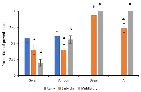 Predation rates of soil-exposed FAW pupae in four Indonesian islands of varying size. The graph depicts the average proportion (±SE) of FAW pupae (out of 10) that are not recovered after 24 h, following exposure on the soil surface. Data are shown for three separate sampling events on Seram and Ambon, and two sampling events on Besar and Ai islands. Statistical differences are indicated by different (capital, lowercase) letters above each bar (Kruskal–Wallis, p < 0.05). Statistical data are provided in the main text.