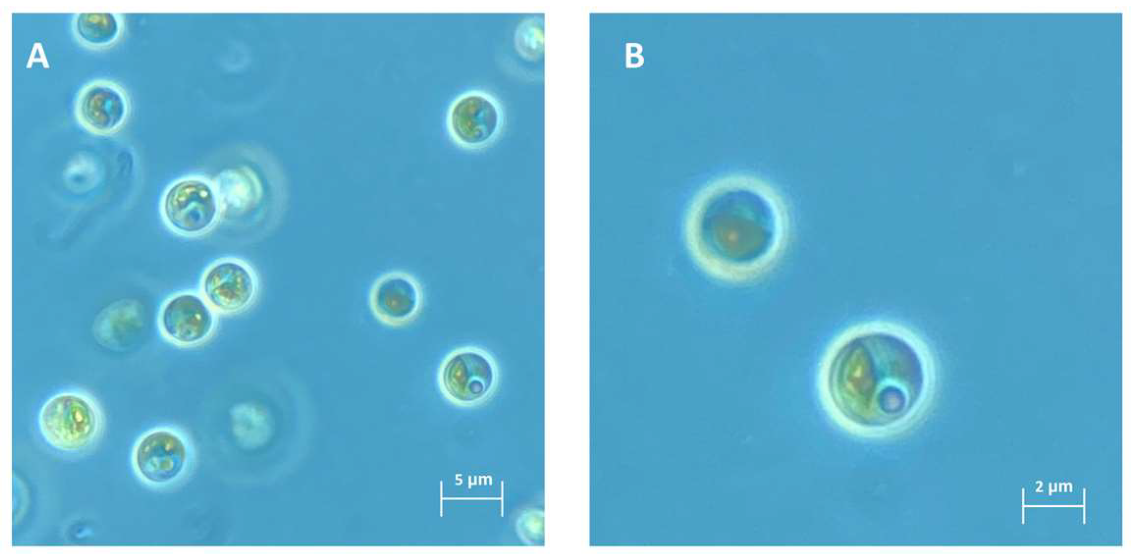 The microalga strain NFX-FRZ presented a spherical form, with cells of approximately 3.5 × 3.2 μm (Figure 1A,B). The non-motile cells did not present any coverage or appendages and reproduced asexually by autospores. A single cup-shaped chloroplast containing a well-defined pyrenoid was found (Figure 1A,B). The cells contained well defined starch and lipid bodies (Figure 1A,B).