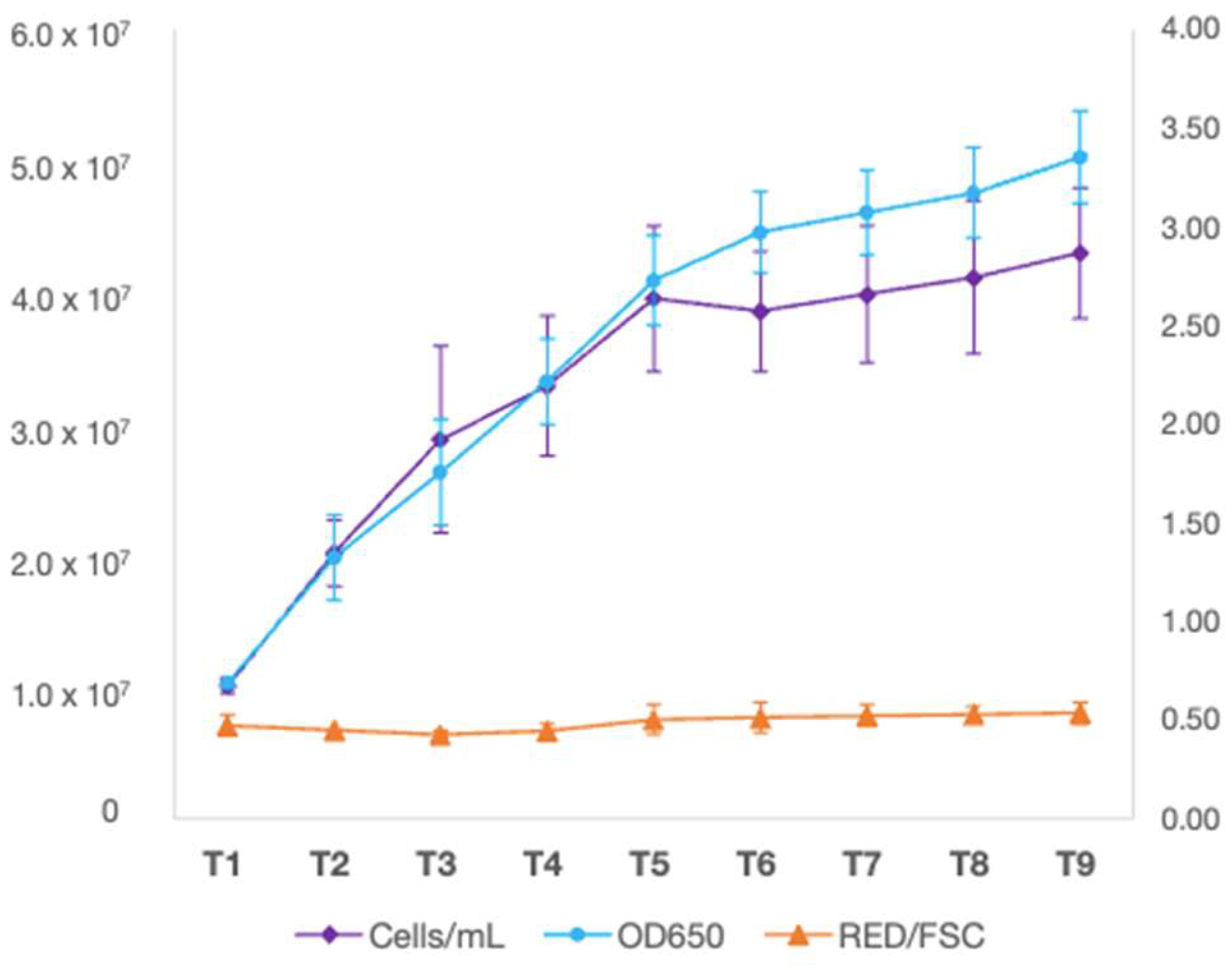 Figure 3. Micractinium rhizosphaerae NFX-FRZ growth dynamics when cultivated in algae culture broth (1.5×) for 9 days.