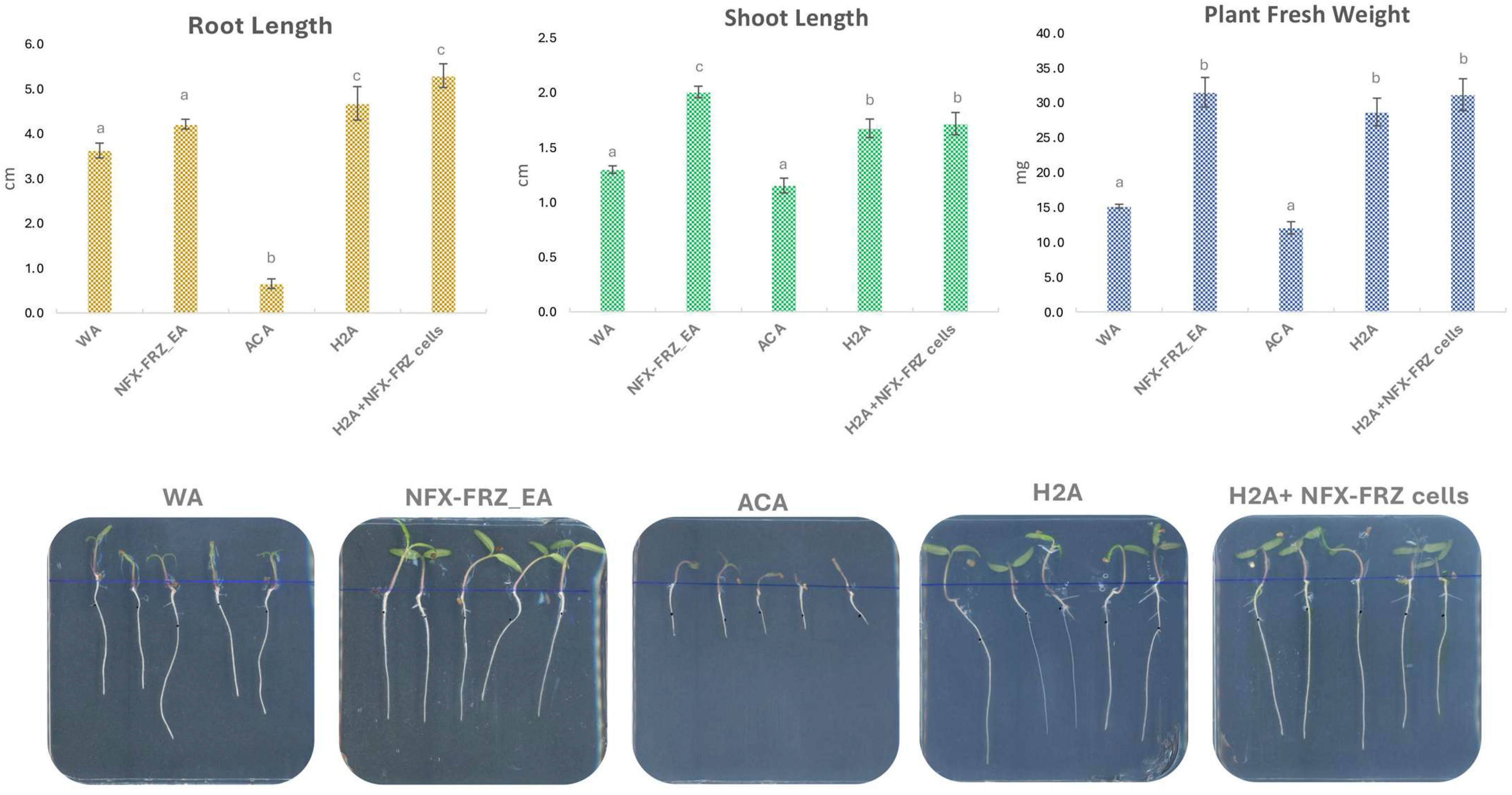 Figure 4. Results obtained from the tomato plant growth promotion assays. Different letters above the bars represent statistical differences (p < 0.05). WA—water agar; NFX-FRZ_EA—NFX-FRZ exudates agar; ACA—algae culture agar (1.5X algae culture broth + 0.5% Agar); H2A—Hoagland’s No. 2 basal salt agar.