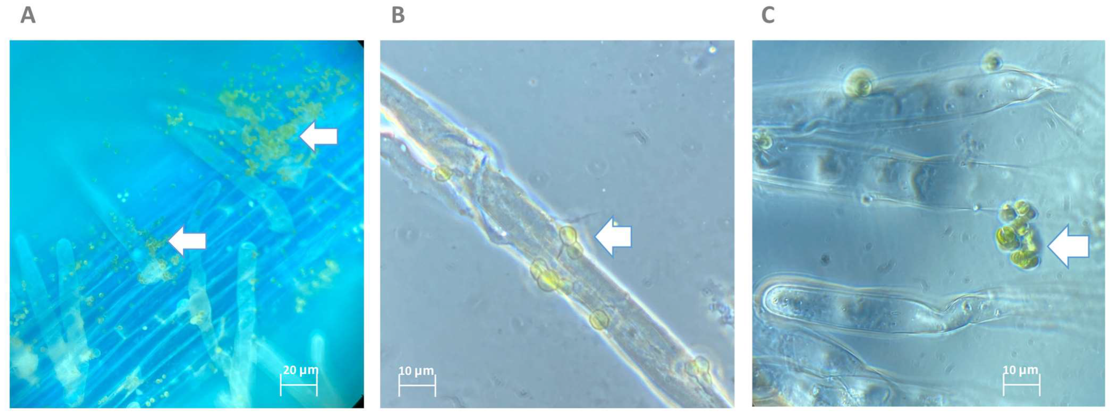 Figure 5. Microscopy observations of the tomato root colonization abilities of Micractinium rhizosphaerae NFX-FRZ. Arrows indicate the presence of the NFX-FRZ strain. (A) overview of the primary root tissue; (B) NFX-FRZ cells attached to plant root hairs; (C) clusters of NFX-FRZ cells bound to plant root hairs.