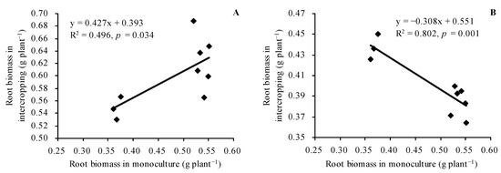 The root and shoot biomasses of C. betacea were lower than that of diploid, tetraploid, and hexaploid. The biomass order in different ploidies was diploid < tetraploid < hexaploid (Figure 1A,B). Compared with C. betacea monoculture, intercropped with diploid, tetraploid, and hexaploid decreased the root biomass of C. betacea by 6.07%, 15.63%, and 19.23%, respectively, and decreased the shoot biomass of C. betacea by 9.30%, 20.15%, and 23.13%, respectively. The root and shoot biomasses of different ploidies in intercropping were higher than that of their respective monoculture. In addition, the root biomasses of intercropped diploid, tetraploid, and hexaploid were linearly positively correlated with the root biomasses of their respective monoculture (r = 0.704, n = 9, p = 0.034, Figure 2A). The root biomasses of intercropped C. betacea were negatively correlated with the root biomasses of monoculture diploid, tetraploid, and hexaploid (r = −0.896, n = 9, p = 0.001, Figure 2B). The shoot biomasses of intercropped diploid, tetraploid, and hexaploid were positively related to the shoot biomasses of their corresponding monoculture (r = 0.922, n = 9, p = 0.000, Figure 2C). The shoot biomasses of intercropped C. betacea were linearly negatively correlated with the shoot biomasses of monoculture diploid, tetraploid, and hexaploid (r = −0.796, n = 9, p = 0.010, Figure 2D).