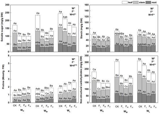 Changes in water and nutrient conditions affect photosynthetic processes during plant growth. Non–structural carbohydrates (NSCs) and proline play critical roles in plant physiological processes. Non-structural carbohydrates are crucial for fulfilling multiple functions in plants, including metabolism, transport, osmoregulation, and export as substrates for soil organisms. They are primarily composed of soluble sugars and starch. Starch supplies plants with energy and carbon resources. The released sugars and other derived metabolites support plant growth and mitigate the negative effects of stress by acting as osmotic protective substances and compatible solutes []. Proline and soluble sugars, which are important osmosis-regulating substances in plants, enable plants to adapt to changes in external environmental conditions by reducing their osmotic potential []. Drought–affected plants accumulate large amounts of proline and soluble sugars to adapt to drought, which affects their photosynthetic capacity and starch synthesis. According to previous studies, the total starch and maximum and average accumulation rates decrease in drought-affected sorghum during the middle and late filling stages []. Under various irrigation levels, plants fed with an appropriate amount of nitrogenous fertilizer accumulate more proline and soluble sugars in the leaves, whereas overfertilization inhibits the increase in soluble sugar content []. However, the expression and transfer of soluble sugars and proline in different plant components require further elucidation.