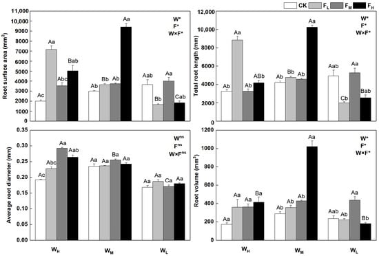 Changes in root system of Festuca coelestis under different water and fertilizer treatments. Notes: W, F, and W×F indicate the effects of water and fertilizer and their interaction results in the ANOVA (p < 0.05). Asterisks (*) and ns indicate significant differences. Uppercase and lowercase letters represent the differences between the water and fertilizer treatments.