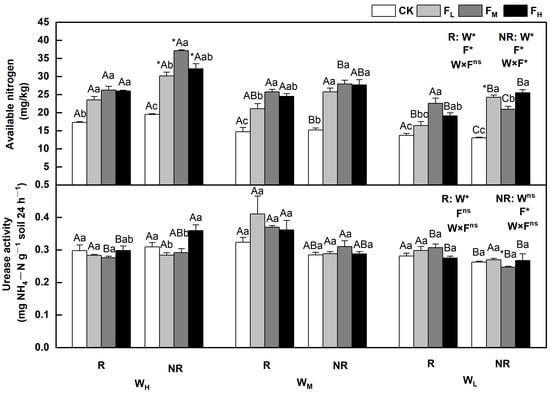 Changes in available nitrogen and urease in the soil under different water and fertilizer treatments. Note: R and NR indicate rhizosphere and bulk soils, respectively. W, F, and W×F indicate the effects of water and fertilizer and their interaction from the results of the ANOVA (p < 0.05). Asterisks (*) and ns indicate significant differences. The uppercase and lowercase letters represent the differences between the water and fertilizer treatments. Asterisks before letters indicate significant differences between the rhizosphere and bulk soils.