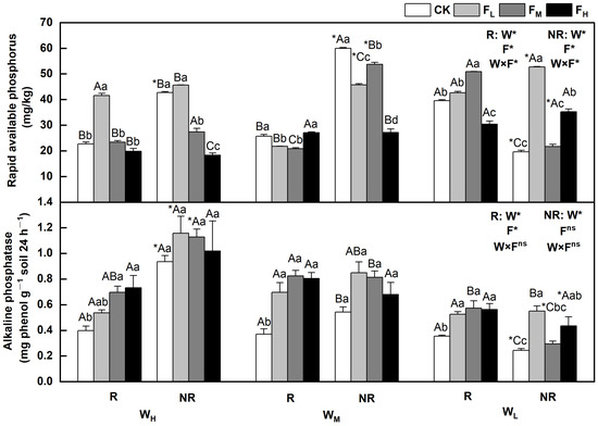Changes of rapidly available phosphorus and alkaline phosphatase in the soil under different water and fertilizer treatments. Note: R and NR indicate rhizosphere and bulk soils, respectively. W, F, and W×F indicate the effects of water and fertilizer and their interaction from the results of the ANOVA (p < 0.05). Asterisks (*) and ns indicate significant differences. The uppercase and lowercase letters represent the differences between the water and fertilizer treatments. Asterisks before letters indicate significant differences between the rhizosphere and bulk soils.