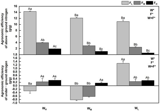 Changes in agronomic efficiency of nitrogen of Festuca coelestis under different water and fertilizer treatments. Notes: W, F, and W×F indicate the effects of water and fertilizer and their interaction from the results of the ANOVA (p < 0.05). Asterisks (*) and ns indicate significant differences. The uppercase and lowercase letters represent the differences between the water and fertilizer treatments.