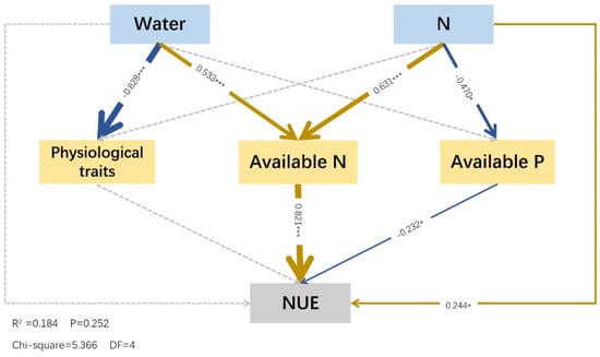 Structural equation model of effects of water and fertilizer on physiological properties and soil nutrients. Notes: The colored and gray arrows represent significant and non–significant relationships, respectively (* p < 0.05, and *** p < 0.001; only the values of path coefficients with significance are presented in SEM). Positive correlations are indicated by dark blue arrows, and negative correlations are indicated by yellow arrows. The arrow thickness represents the values of path coefficients; the thicker the path, the larger the value. The factors, from top to bottom, were water and fertilizer, physiological characteristics, alkali–hydrolyzed nitrogen, available phosphorus, and nitrogen use efficiency. Physiological traits involve the conversion of multiple factor variables (nonstructural carbohydrates and proline) into a set of variables using PCA.