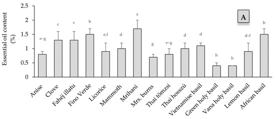 Variability in essential oil production of 15 Ocimum genotypes (A) essential oil content and (B) essential oil yield. Values are presented as Mean ± SD; Different letters indicate significantly different means.