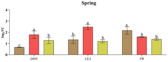 Expression analysis of dehydrin (DHN), the late embryogenesis-abundant protein (LEA) pathogenesis-related protein (PR) in leaves of cv “Filippo Ceo” subjected to different stress factors: drought, pathogen Xylella fastidiosa and a combination of both (spring, summer and autumn) in two-year observations, expressed as log2 fold change (log2 FC). One-way ANOVA with Tukey’s HSD post hoc test was used for the statistical analysis. Different letters correspond to significantly different means.