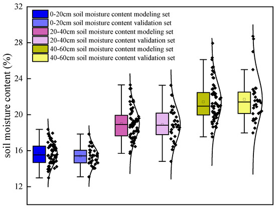 At the jointing stage, SMC samples were obtained for 96 plots across three soil layers (n = 96). Data were split by stratified random sampling into a modeling set (two-thirds of the samples) and a validation set (one-third). Descriptive statistics for each soil layer are shown in Figure 1. Model performance was quantified using the coefficient of determination (R2), root-mean-square error (RMSE), and mean relative error (MRE; also termed mean relative deviation) [,,].