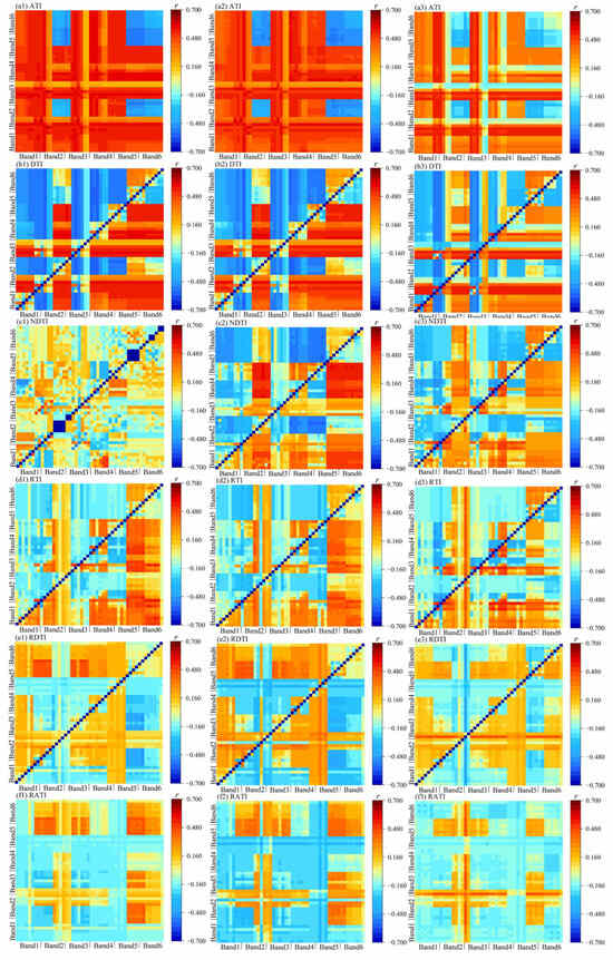 Building on prior studies, six two-band texture indices were constructed. Feature screening followed a correlation matrix approach. We computed Pearson correlations between SMC and each of the 48 band–texture “positions” (8 GLCM metrics × 6 spectral bands), as well as their derived combinations. Features with p < 0.05 were retained. To control multicollinearity among significant features, we removed pairs with inter-feature correlation |r| ≥ 0.90, yielding a nonredundant subset for modeling. Here, Band1–Band6 correspond to blue, green, red, red-edge1, red-edge2, and NIR, respectively; for example, “HOM6” denotes GLCM homogeneity computed from Band6 (NIR) additive texture index (ATI), ratio texture index (RTI), normalized difference texture index (NDTI), difference texture index (DTI), reciprocal difference texture index (RDTI), and reciprocal additive texture index (RATI)—to explore the utility of texture information for UAV-based SMC estimation in winter wheat. Detailed definitions are provided in Table 1. Here, Ti and Tj denote (arbitrarily selected) texture features.