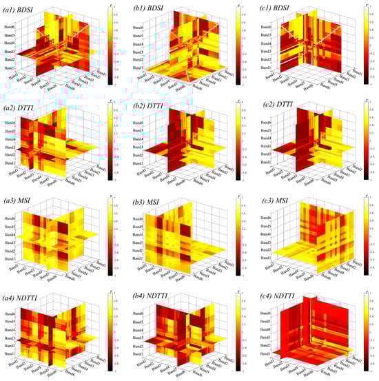 Correlation coefficients between soil moisture content and the 3-D texture index for each winter wheat soil layer. Each cell shows the Pearson correlation (r) between SMC and a 3-D texture index formed by three “positions” (texture × band). The color bar denotes r (−1 to 1); darker colors indicate larger |r|. Example: BDSI (HOM6, MEA2, and VAR3).