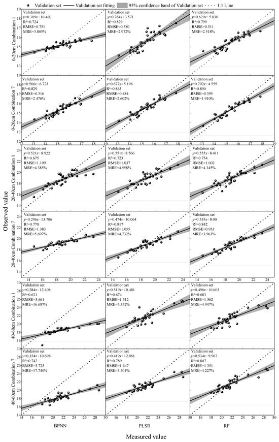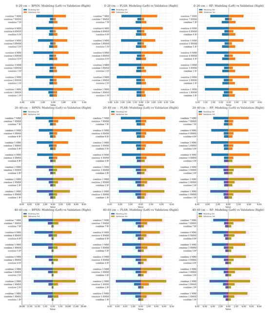 Based on the significant correlations identified above, we assembled different model input combinations from (i) texture features, (ii) two-dimensional texture indices, and (iii) three-dimensional texture indices, and constructed SMC estimation models at three depths using RF, PLSR, and BPNN. Combination 1 comprised significantly correlated texture features; Combination 2, significantly correlated 2-D texture indices; Combination 3, significantly correlated 3-D texture indices; Combination 4, the union of Combinations 1 and 2; Combination 5, the union of Combinations 1 and 3; Combination 6, the union of Combinations 2 and 3; and Combination 7, the union of Combinations 1–3. Modeling results are shown in Figure 4 and Figure 5, which are based on Figure 5’s highlights, the “classical” input (Combination 1) and the best-performing fused input (Combination 7).