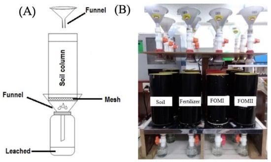 The leaching process was repeated daily for 30 days, and the solution that percolated through the soil columns was collected and stored at 4 °C until analysis. Figure 1 shows the leach system. An analysis of the water percolated by the soil columns was also carried out to ensure that the NPK nutrient input only comes from the formulations.