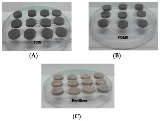 The pH values were acceptable according to NTC 5167. Enterobacteria decreased during the occlusion process relative to the matrix, from 1 × 105 CFU g−1 to 9.5 × 102 CFU g−1. As reported in [], this reduction is consistent with crenation and growth inhibition driven by the osmotic pressure exerted by N, P, and K salts. CEC values for FOMII were slightly higher, likely due to silicate groups in the clay (SiO4)4−, whereas the higher OM and WRC of FOMI support the formation of oxidized complexes and hydrogen bonds, favoring a steadier, controlled nutrient supply []. In contrast, the mineral fertilizer—by formulation—does not contribute to OM or WRC and typically shows burst release in early periods, as also reported elsewhere []. Representative pellets of the three treatments are shown in Figure 2A–C).