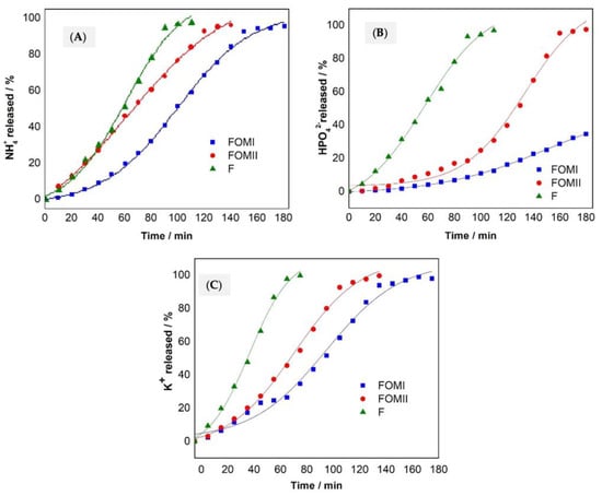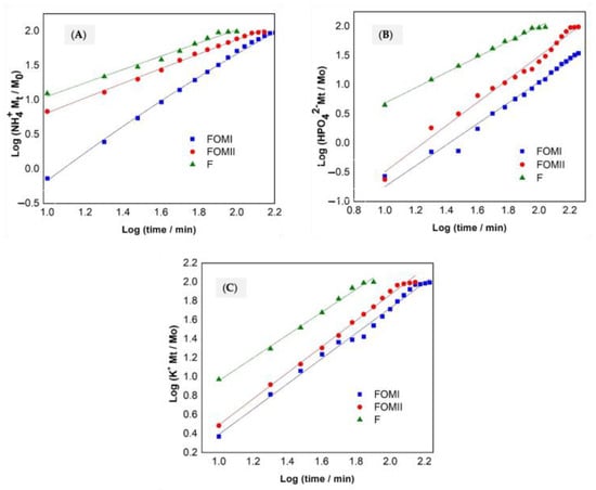 Figure 4 shows the adjustment to the Korsmeyer–Peppas model, and Figure 4. Korsmeyer–Peppas model adjusts (A) Nitrogen as NH4+, (B) Phosphorus as HPO42−, and (C) Potassium as K+.