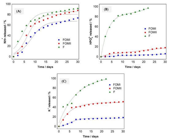 Korsmeyer–Peppas model adjusts (A) Nitrogen as NH4+, (B) Phosphorus as HPO42−, and (C) Potassium as K+.