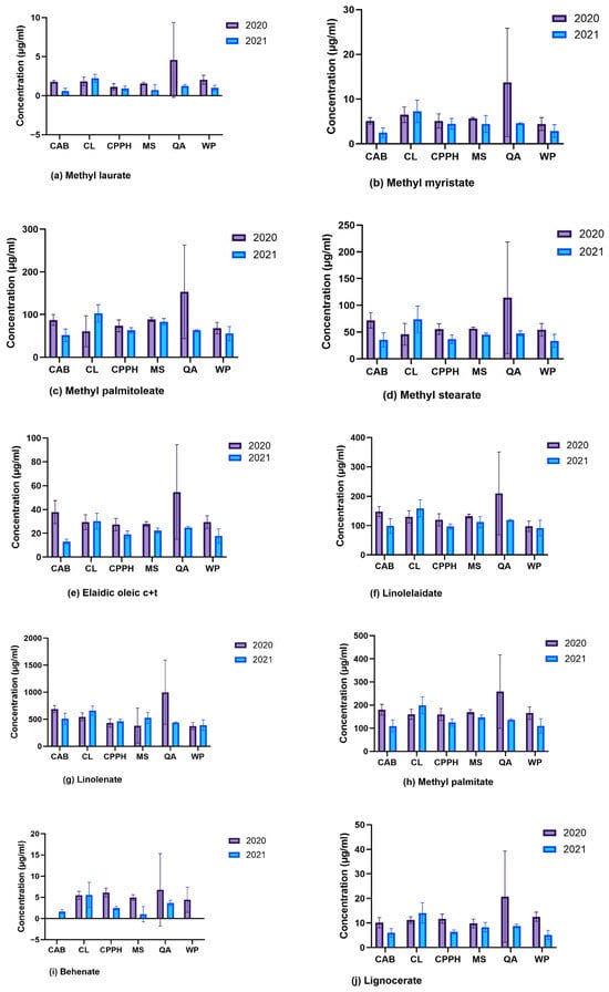 Analysis of variance (ANOVA), followed by pairwise comparisons using Tukey’s post hoc test (raw p < 0.05), was conducted to identify significant differences in mean compound concentrations among varieties and growing seasons. The amount of methyl laurate (p = 0.04), methyl palmitate (p = 0.02), elaidic oleic c + t (p = 0.003), behenate (p = 0.02), and lignocerate (p = 0.02) varied significantly between seasons, with the highest concentration of these compounds observed in samples from 2020. QA exhibited the highest concentrations of all compounds detected in 2020, and CL exhibited the highest concentrations of all compounds in 2021, while the low concentrations of most compounds were detected in CAB, WP, CPPH, and MS (except for methyl palmitoleate and methyl stearate, in both seasons). Methyl palmitate was highly abundant in the QA variety (258.415 µg/mL) compared to other significant FAMEs in all varieties. Lignocerate was highest in the QA variety (2020), followed by the CL (2021), and lowest in the CAB and WP varieties in 2021. Behenate was not detected in the CAB and the WP varieties in 2020 and 2021, respectively. Methyl laurate and behenate (1 μg/mL) were the least abundant in the CAB and MS varieties, respectively, in 2021. In 2021, the CAB variety had the lowest concentration of many compounds, including elaidic oleic c + t, methyl laurate, and methyl myristate (Figure 1a–j).
