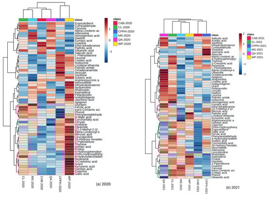 The CAB variety had the highest number (17 and 22) of phytochemicals with the lowest peak area in 2020 and 2021, respectively (Figure 2a,b). The phytochemicals isoliquiritigenin, glycitein, ferulic acid, (Z)-3-methyl-2-(2-pentenyl)-2-cyclopenten-1-one, and benzoic acid decreased in the CAB variety in both seasons. D-malic acid and trans-cinnamic acid peak areas were high in CL and MS in both seasons and were lowest in the CAB and QA varieties in 2021 and in CPPH in both seasons.
