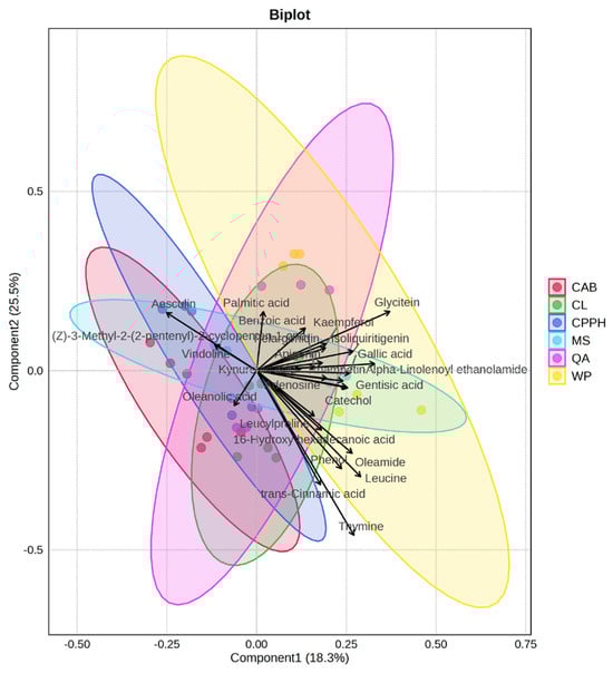 Partial least squares discriminant analysis (PLS-DA) biplot of metabolic profiles across six cowpea varieties, showing a clear discrimination between groups (CAB, CL, CPPH, MS, QA, and WP cowpea varieties) based on the phytochemical data. The colored ellipses represent 95% confidence intervals for each group. Loading vectors indicate the contribution of individual metabolites to group separation. Each point represents an individual sample, and the vector length indicates the magnitude of metabolite contribution to the discriminant model. Note: CAB—California Blackeye Pea, CL—Colossus, CPPH—Coronet Pinkeye Purple Hull, MS—Mississippi Silver, QA—Queen Anne, and WP—Whippoorwill Steele’s Black.
