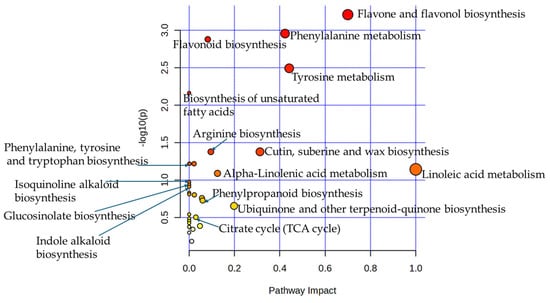 Pathway analysis for metabolite biosynthesis was performed using MetaboAnalyst 6.0 software with reference to the KEGG pathway in the Arabidopsis thaliana database; metabolites showing significant enrichment (both raw p < 0.05 and FDR < 0.10) and/or with biological impact scores were explained.