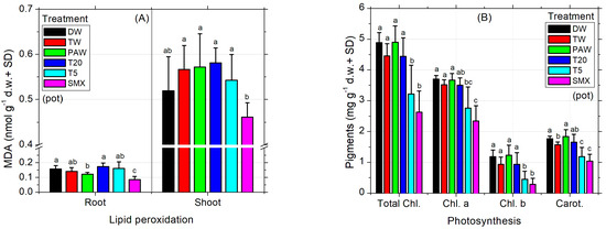 The MDA levels recorded in SMX-treated roots were the lowest compared to all treatments, while in shoots they were appropriate to the DW control (Figure 4A). T20 induced comparable values to all controls. Although the low level of MDA from SMX treatment seems beneficial for the plant, the photosynthesis was affected as the total chlorophyll (a and b) and carotenoids were strongly decreased compared to all treatments and controls, except the T5 solution (Figure 4B). Improvements of lipid peroxidation status compared to the absolute DW control by low MDA content are shown in the PAW treatment (Figure 4A) without effects on assimilatory pigments in shoots and leaves (chlorophylls and carotenoids, Figure 4B), although the average seed germination was significantly lower than the T20 treatment (Figure 2C). Also, stomatal conductance of the leaves significantly increased in PAW compared to TW, T5, and SMX (Figure 4C). As expected, the T20 treatment showed a low level of phytotoxicity for assimilatory pigments and photosynthesis, with no significant differences between controls (Figure 4B).