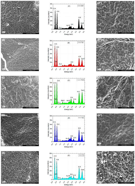 Low (L) and high (H) images of the leaf surface reflect the tissue microarchitecture and state of stomata. It can be observed that the presence of the SMX concentration is correlated with the appearance of the crystal abundance on the probes from clean water (DW) to polluted water (SMX). A denser abundance can be observed in Figure 7E,E″ for T5 and also a blocked ostiole detailed in Figure 7F″ for SMX treatment. EDX analyses of leaves automatically detected the most abundant elements present in a sample from a distance of 50 μm above. Element differences between treatments were shown in separate plots and a merged spectra expanded to 1000 units of distance between treatments (Figure 7G). In the PAW sample, the element Mg was automatically detected (Figure 7C′), but not into the rest of the treatments, although still present (Figure 7G). Another particular finding was a decrease in Cu on the L line and the appearance of a high pick of Au on the M line in the SMX spectra (Figure 7F′).
