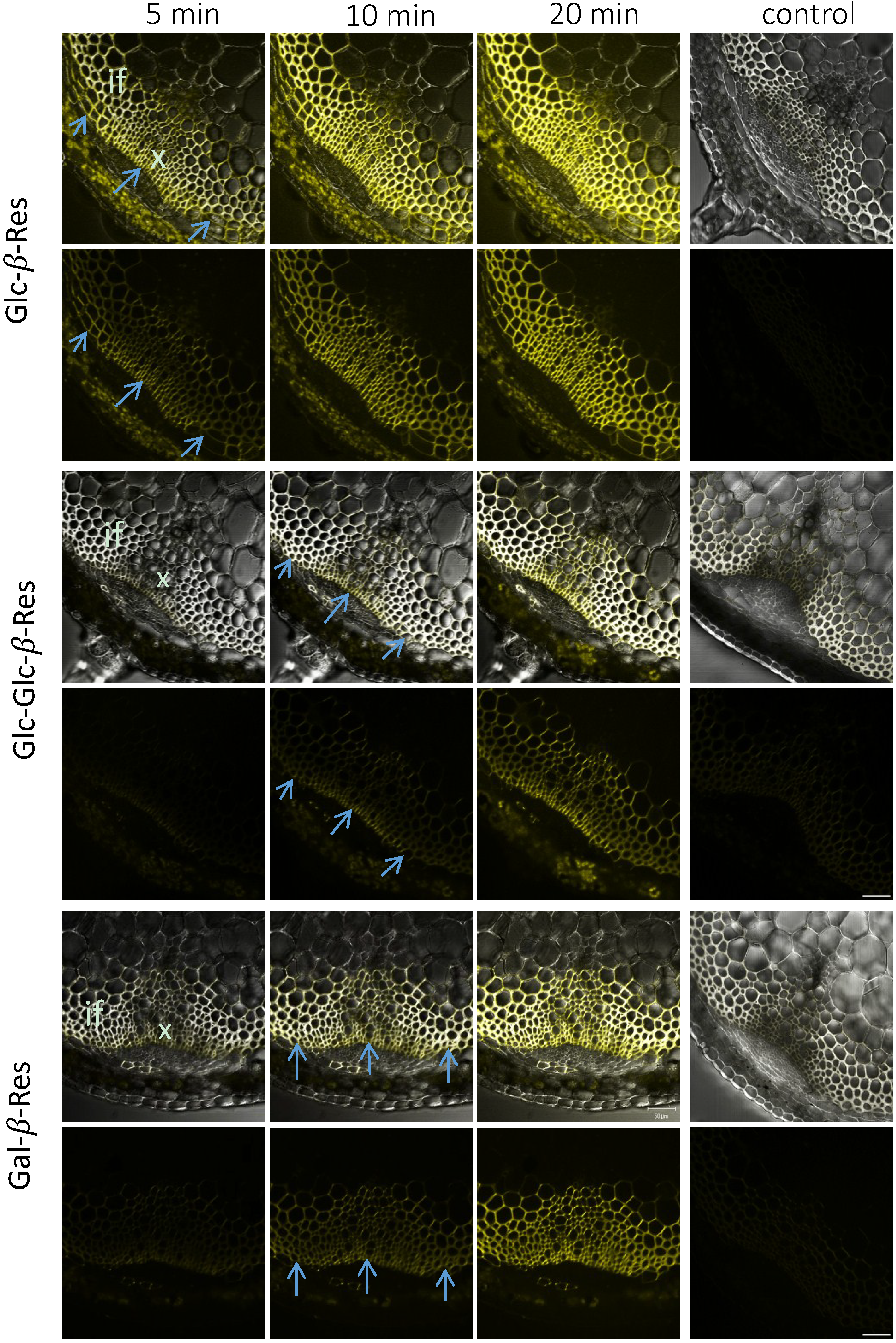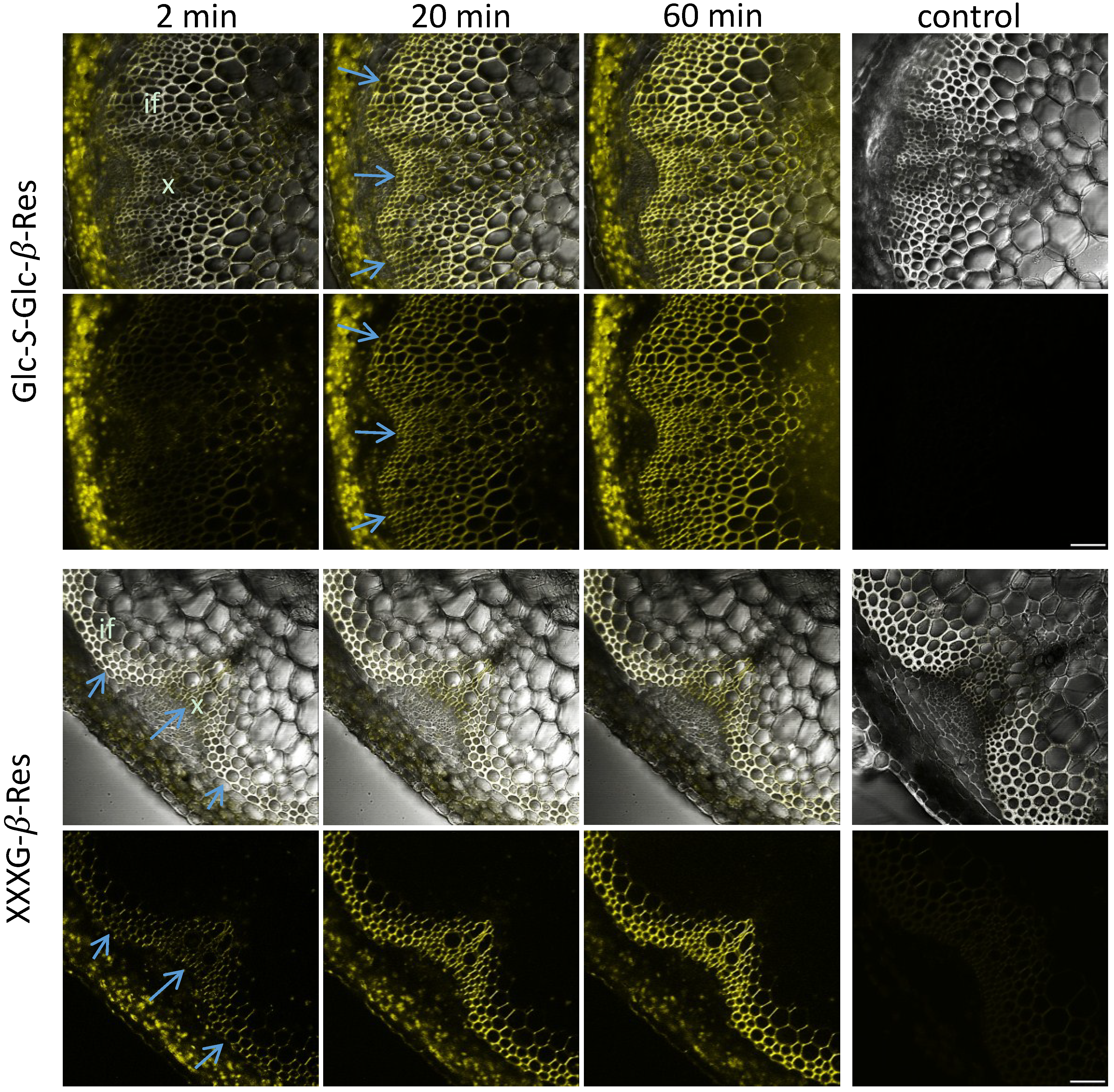 The signal evolution with Glc-β-Res, Glc-Glc-β-Res, Glc-S-Glc-β-Res and Gal-β-Res in stem sections was similar. Signals were first detected in the outer cylinder of sclerenchyma tissues, corresponding to the youngest cells developing a secondary cell wall (blue arrows in Figure 2 and Figure 3). With ongoing incubation, the signal became more intense and gradually appeared throughout all of the cells of the sclerenchyma. This labeling pattern was distinct from that observed with XXXG-β-Res, which produced a signal only in the mature sclerenchyma cells and had an unchanged distribution pattern throughout the whole incubation time (Figure 3). The difference in signal resulting from XXXG-β-Res and the other substrates can be also distinctly seen in time-lapse movies (Supplemental Materials 2–6).