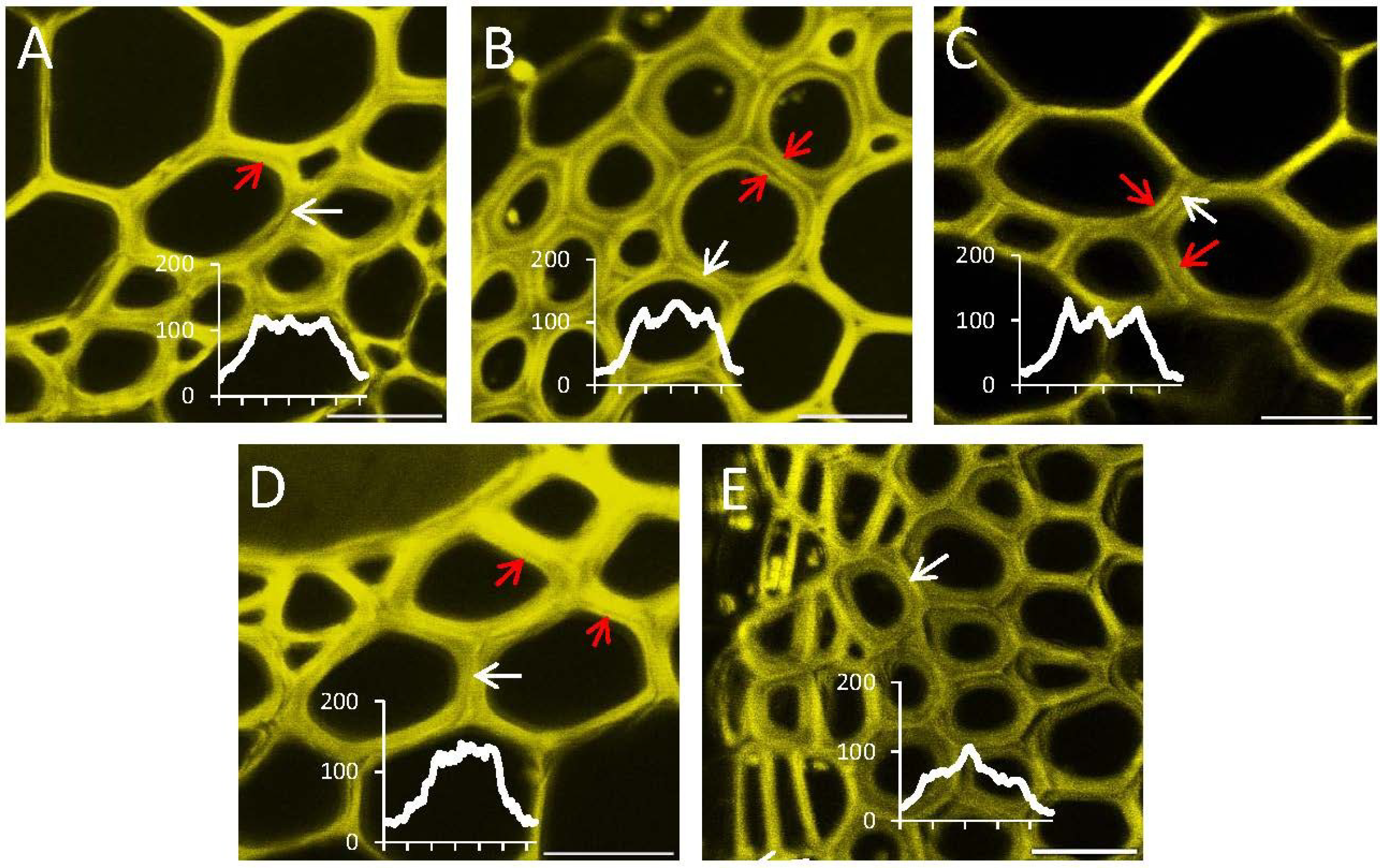 Distribution of signals from different glycoside hydrolase activities in the cell walls of interfascicular fibers in Arabidopsis stems. (A) Glc-β-Res; (B) Glc-Glc-β-Res; (C) Glc-S-Glc-β-Res; (D) Gal-β-Res; (E) XXXG-β-Res. All reactions were carried out in optimal conditions (Table 1). The yellow fluorescence channel with resorufin signals is shown. Signals from the compound middle lamella are shown with the white arrows, and signals from the recently formed secondary wall layers are shown with red arrows. Intensity profiles through the cell wall area, shown by the white arrows, are included to visualize the labeling patterns in the cell wall better. Bar = 50 μm.