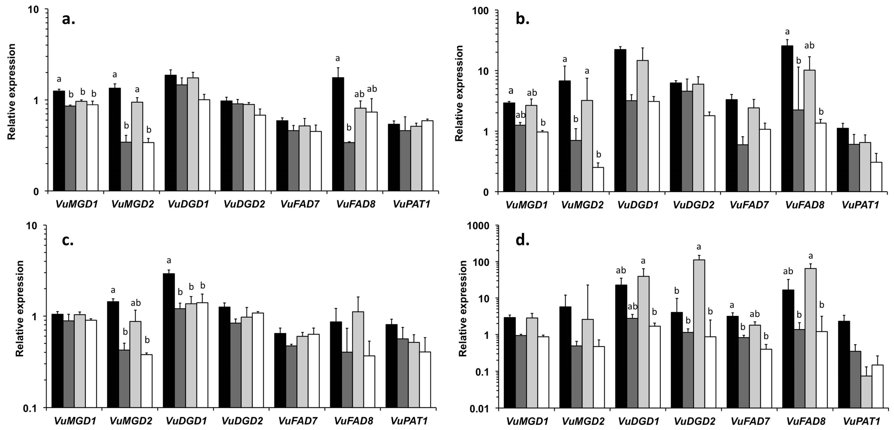 To better understand the observed modifications in plastidial galactolipid, the abundance of transcripts encoding enzymes involved in their biosynthesis, desaturation and degradation were analyzed using quantitative real-time PCR (Figure 3). The genes studied encoded two enzymes of the galactolipid biosynthesis pathway (MGDG synthase, EC 2.4.1.46: VuMGD1 and VuMGD2; DGDG synthase, EC 2.4.1.241: VuDGD1 and VuDGD2), two chloroplastic ω-3 fatty acid desaturases (EC 1.14.19.3, VuFAD7 and VuFAD8) and the patatin-like lipid acyl hydrolase (EC 3.1.1.26: VuPAT1). Values obtained for the target genes were normalized with respect to the expression of the reference gene VuEF1-α.