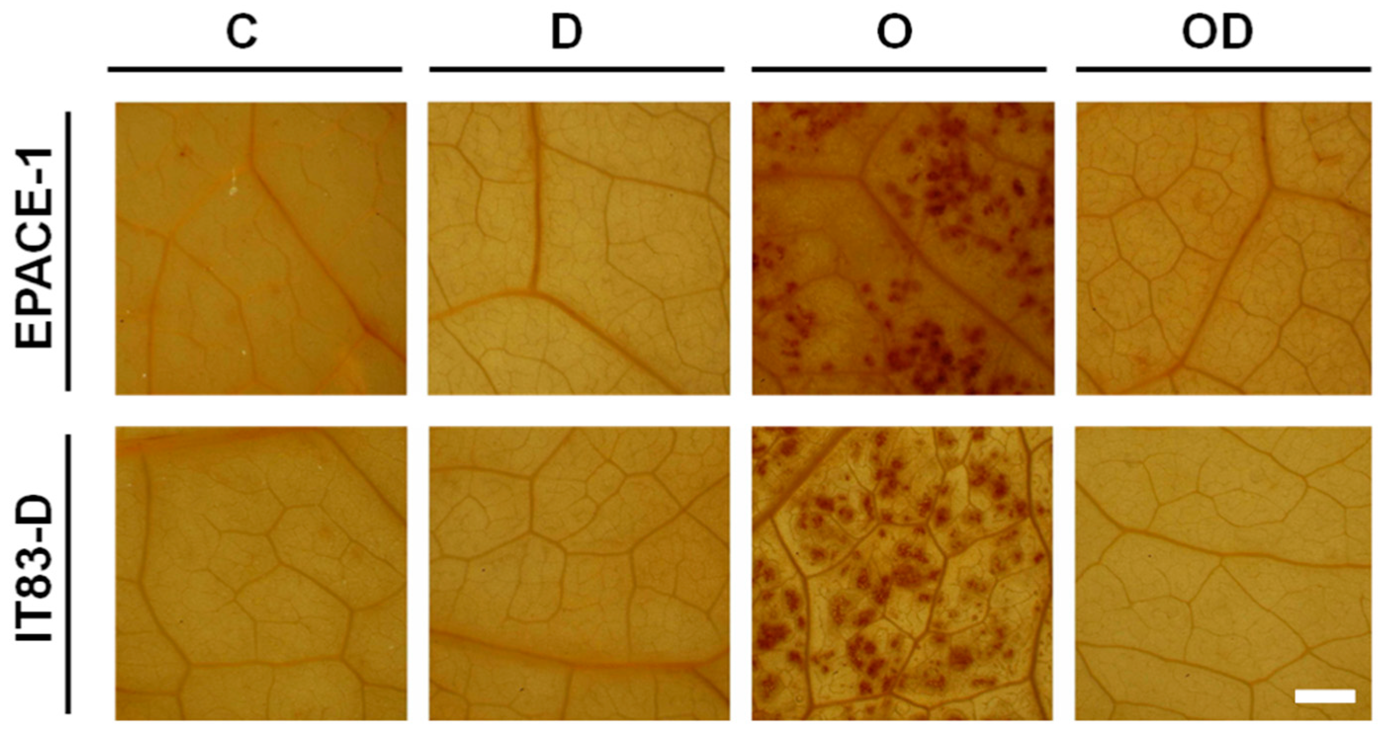 When the plants were exposed to drought in combination with ozone, the POD0 was 24% (2.9 mmol·m−2) and 33% (3.1 mmol·m−2) lower in EPACE-1 and IT83-D, respectively, as compared to plants treated with ozone only (Table 1). Consistently, the extent of leaf injury was less important in OD-treated than in O-treated plants and no H2O2 could be detected in leaves of the in OD-treated plants (Figure A1). At the whole-plant level, the effects of the combination of ozone and drought stresses were essentially the same as those of the drought treatment alone (Figure 1).