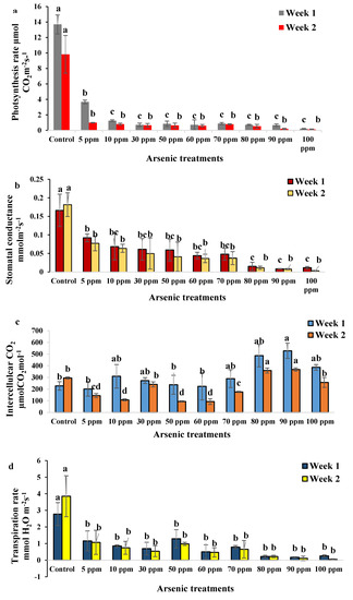 The highest transpiration rate was obtained in control samples at 3.31 mmol H2O m−2·s−1 followed by those under 50 ppm arsenic treatment at 1.13 mmol H2O m−2·s−1. Contrariwise, the lowest transpiration rate was recorded in plants treated with 90 ppm arsenic at 0.14 mmol H2O m−2·s−1, followed by those treated with 100 ppm arsenic at 0.15 mmol H2O m−2·s−1 (Figure 5d). Arsenic accumulation also caused significant poor growth due to enhancements to the peroxidation lipid and content hydrogen peroxide which led to a significant reduction in the transpiration rate, photosynthesis rate, and stomatal conductance of Ricinus communis genotypes [59,60]. Inhibition of the transpiration rate was caused by stomata closure [61,62], xylem embolism [63], and leaf damage [64]. In the current research, the results indicated that plants treated with different concentrations of arsenic suffered a significant decline in transpiration rate as compared with the controls. The same results in gas exchange attributes were observed in a study that focused on the effect of arsenic toxicity on the photosynthesis growth of rice seedlings, and recorded that higher durations of arsenic treatment caused a greater decline in transpiration rates [55].
