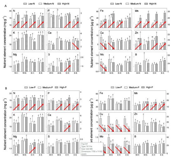 We then compared “Emek” and “Wonderful” trees subjected to three different P levels in the irrigation solution: low (1 mg P L−1), medium (10 mg P L−1), and high (20 mg P L−1) (levels were the same for both cultivars). An increasing P level in the irrigation solution positively affected P concentration in both hermaphroditic and staminate flowers, for both cultivars (Figure 2B). N and Mn responded similarly. P level also positively affected Ca and Mg concentrations in hermaphrodites of “Emek”, but negatively affected Cu and Mo concentrations in both flower types of both cultivars.