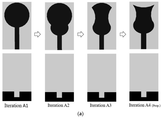 The conventional circular monopole antenna with a radius of 5.6 mm with a full ground plane is initially designed and simulated. To realize the broader frequency of operation, a circular patch is modified by embedding the ellipse between the feedline and patch onto the radiator. Further, the radiator is carved using circles on the left, right, and top, with the ground plane, lowered sequentially in association with the reflection coefficient (S11) curve. Further, a U-shaped slot is carved from the ground plane to achieve a wider impedance bandwidth. The evolutional stages of the radiator and its S11 curves are depicted in Figure 1. The antenna in iteration A1 has an operational frequency of 3.2–6 GHz and is due to the modification of the ground plane. In the second iteration A2, an ellipse is embedded between the feedline and radiator. This configuration provides wider bandwidth, but at the center frequency, the S11 curve falls short of lying below the −10 dB line. Further, the radiator is truncated on the left and right side by the arcs as in iteration A3 of Figure 1a. In a similar manner, an arc etches the proposed antenna radiator’s upper part, and this arrangement provides wider bandwidth below −12 dB from 4–12.1 GHz.
