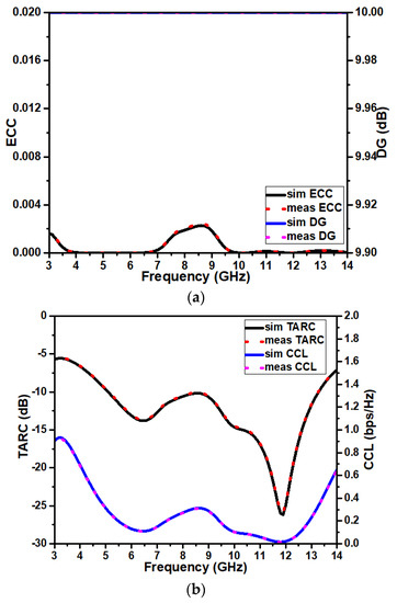 The MIMO diversity features of the proposed antenna are evaluated. In MIMO systems, the envelope correlation coefficient (ECC) defines the level of coupling between the antenna elements. The signal-to-interference ratio is described by diversity gain (DG), which is connected with the ECC. The threshold values for ECC and DG are less than 0.5 and approximately 10 dB. The mean effective gain (MEG) refers to the average gain experienced by the transmitted signals in an MIMO channel. It is a measure of the combined influence of antenna gain, propagation environment, and channel spatial features. The total active reflection coefficient (TARC) of an N-port antenna is the square root of the total of all outgoing powers at the ports divided by the sum of all incident powers at the ports. An MIMO antenna system’s channel capacity loss (CCL) refers to the system’s highest attainable data rate or capacity in a specific communication channel. The presence of noise, interference, and the features of the MIMO antenna system all impact the channel capacity. MEG, TARC, and CCL acceptable values are <−3 dB, <−10 dB, and <0.4 bps/Hz. The proposed antenna demonstrates the value of diversity features as ECC < 0.002, DG is approximately 10 dB, MEG < −3 dB, TARC < −10 dB, and CCL < 0.3 bps/Hz, as depicted in Figure 12, and are computed using Equations (6)–(10).