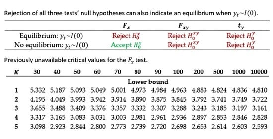 | 11 | When an equilibrium exists through cointegration with , all three tests’ null hypotheses should be rejected, and this is indicated in row 3 of Table 1. |