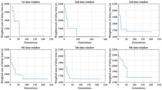 We also note that the time decomposition strategy can divide the large-scale problem into several subproblems for solving to achieve the optimal solution [37]. Among them, the receding horizon Control (RHC) strategy has been shown to be a very effective optimization strategy for large-scale optimization problems with complex constraints [13]. In the RHC strategy framework, the original optimization problem is partitioned into several subproblems, thus increasing the problem solution rate. Hu [38] established a dynamic arrival aircraft scheduling model based on the RHC. The arrival aircraft scheduling model has good robustness, and the RHC strategy can achieve an optimal solution quickly. Using the RHC strategy to make relevant decisions is required to look forward to multiple time horizons. When optimizing the current time horizon, the aircraft information is optimally scheduled forward over multiple time horizons, but only the results are implemented on the current horizon and the same process is repeated on the next horizon. Clarke [39] combined the RHC strategy with predictive techniques to update each piece of operational information of aircraft in real time to recalculate the uncertainty delays every 15 min. Kjenstad [13] applied the RHC strategy by dividing the length of time horizon into 10-to-15 min and adjusting the number of time horizons to find a combination of parameters with fast speed and high accuracy. The feature that the RHC framework is more adaptable also draws our attention, and it can hybridize with other heuristic strategies to improve the efficiency of the problem solving. For example, Qiqian Zhang [40] combined the RHC strategy with a genetic algorithm (RHC-GA) to guarantee the solution quality and improve the solving speed.