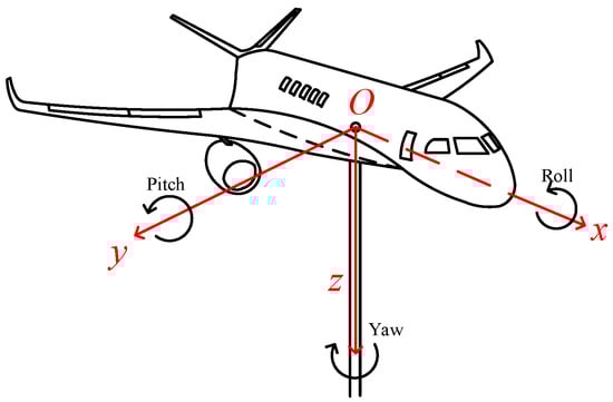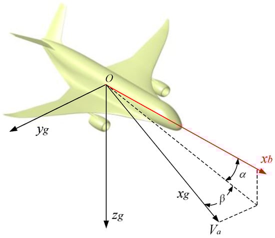 In order to build the aerodynamic parameter identification model for wind tunnel virtual flight tests, a flight dynamics model is first needed. The common practice currently is to omit the aircraft’s equations of translational motion and only consider its rotational motion []. This approach does not take the forces of the support device into account in the equations of motion and is not conducive to analysing the differences between wind tunnel virtual flight and free flight dynamics of the test model.