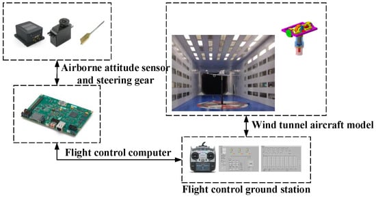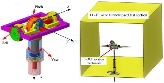 At present, the most widely used wind tunnel virtual flight test is a dynamic flight test with three degrees of freedom []. As shown in Figure 1, in the wind tunnel virtual flight test, the test model is connected with the support rod through a three-degree-of-freedom rotating mechanism and installed in the wind tunnel test section, so that the linear displacement of the model is fixed, but it has three angular motion degrees of freedom. Open-loop and closed-loop control of the test model are achieved by driving the control surface directly or by using the flight control law to drive the control surface, respectively [].