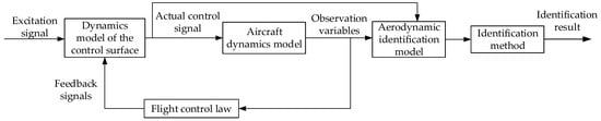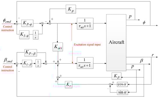 The traditional design method of the excitation signal is to solve for the optimal excitation signal by minimizing the deviation or covariance of the aerodynamic parameter identification results []. For open-loop controlled aircraft, the above excitation signal design methods are applicable. However, for aircraft with a control augmentation law, since the above signal design method does not consider the feedback effect of the flight control law (as shown in Figure 6), the flight control law may have a significant effect on the excitation signal [], so it cannot guarantee that the actual maneuvering signal of the aircraft can adequately excite the motion characteristics of the aircraft.
