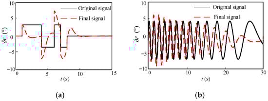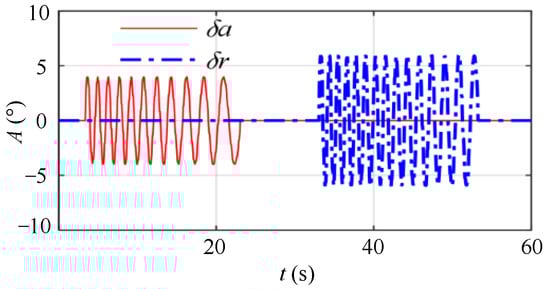In order to ensure the accurate identification of aerodynamic derivative, it is necessary to design the appropriate frequency range and amplitude of the excitation signal. If the frequency and amplitude of the signal are inappropriate, the lateral-directional modal characteristics of the aircraft cannot be fully excited, thus reducing the accuracy of the identification results []. The existing excitation signal design methods have two kinds: one is to establish a simulation model and calculate the time domain to analyse the response size of each aerodynamic force or moment component in the process of aircraft motion, so as to ensure that the aerodynamic force or moment magnitude caused by the aircraft motion variables (β, p, r, ϕ) and control variables (δa, δr) meet the identifiable requirements, to determine the frequency and amplitude range of the signal [,]; and the accuracy of the identification results of various aerodynamic derivatives can be guaranteed by designing complex orthogonal multi-sine optimization excitation signals [,]. These two methods require a large amount of calculation and complicated steps, and they are not suitable for the excitation signal design of aircraft with closed-loop flight control law, because the flight control law will have a feedback effect on the initial signal input, resulting in a large difference between the final control surface deflection and the initial input signal.