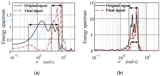 As seen from Figure 7, the flight control law has a large effect on the 3211-multipole square wave signal, with a large irregular change in the waveform, while it has a small effect on the frequency sweep signal, with a slight change in frequency. The frequency spectrum of the time-domain changes of the above two types of excitation signals is analysed by fast Fourier transform, and the frequency band changes of the signal energy distribution are observed, as shown in Figure 8.
