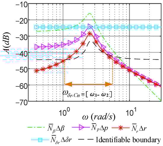 According to Equation (15), 1/10 of the total response amplitudes of the yawing moment, rolling moment and side force at different rudder frequencies can be calculated and connected to a curve. The dashed line in Figure 9 is the demarcation line corresponding to 1/10 of the total response amplitude of the yawing moment, which is defined as the identifiable boundary of yawing moment derivatives corresponding to different rudder frequencies. Using the same method, identifiable boundaries for the rolling moment, as well as the side force derivatives, can also be obtained.