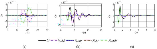 To ensure the identifiability of each yawing moment derivative, the magnitude-frequency response magnitudes of the yawing moment components , , , and caused by the sideslip change Δβ, yaw rate change Δr, roll rate change Δp, and rudder deflection Δδr should not differ significantly. The time domain curves of each yawing moment component, with different frequencies of rudder signal inputs, are given in Figure 10.
